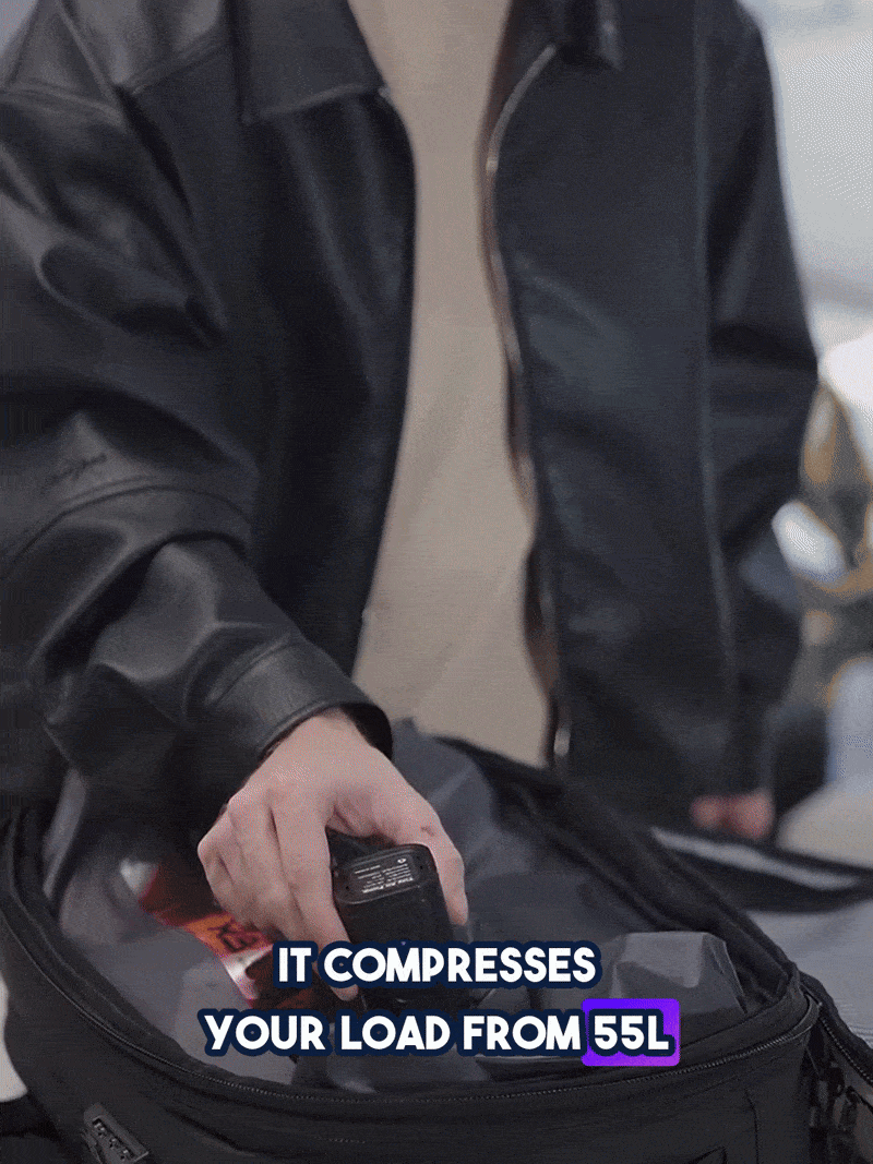 Travel stress-free, knowing you have 57% more space instantly. In seconds the backpack compresses 55L into a 36L carry, letting you pack more without sacrificing essentials.